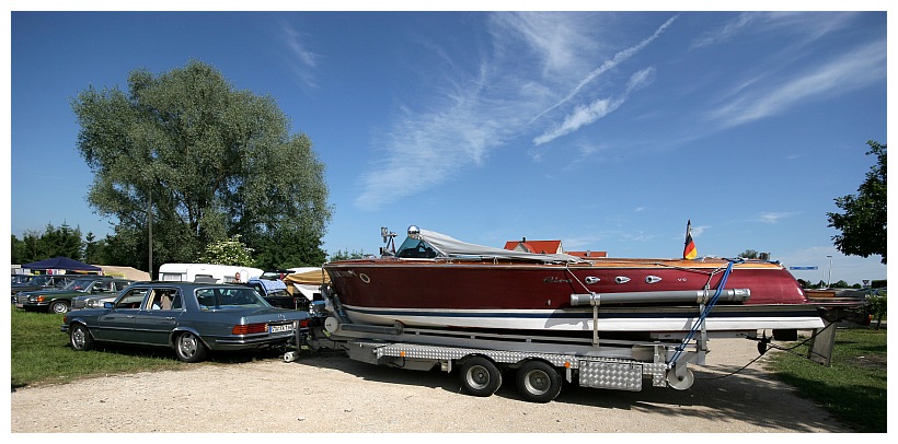 Das Schiff: W116 8 Zylinder mit Riva Motorboot.